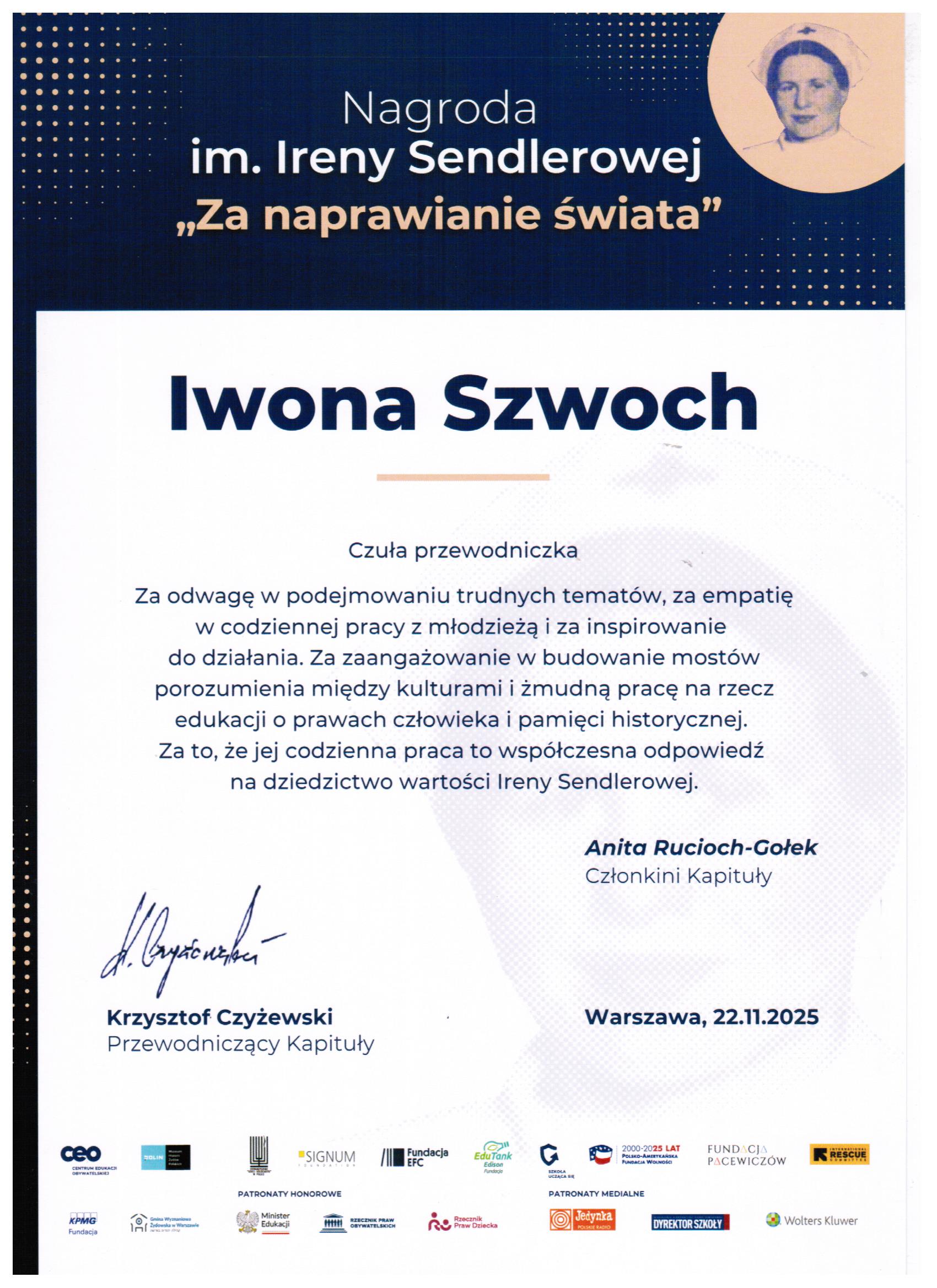 Pani Iwona Szwoch znalazła się w gronie zaledwie dwunastu wyróżnionych nauczycieli z całej Polski. Czternastu członków Kapituły Nagrody doceniło jej wyjątkowe działania wychowawcze, projekty integrujące młodzież oraz konsekwentną pracę na rzecz budowania kultury dialogu, empatii i odpowiedzialności w naszej szkole. Uroczyste wręczenie wyróżnień odbyło się 22 listopada w Muzeum Historii Żydów Polskich POLIN w Warszawie, przy udziale organizatorów, partnerów nagrody oraz środowiska edukacyjnego z całej Polski.